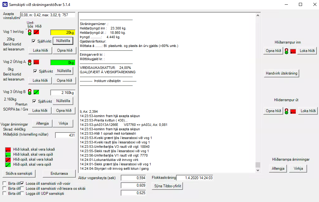Kerfið saman stendur af þrem vogum með hliðstýringu og að auki tvem hliðum fyrir aðgengi bíla sem ekki þarf að vigta t.d verktaka eða starfsmenn. Á inn leið er ein vog á samt fram hjá hleypi hliði fyrir verktaka eða starfsmenn. Til þess að auka rekstar öryggi ef voginn á innleið bilar skyndilega, er mögulegt að nota vog sem er vanalega notuð á útleið fyrir inn vigtun, Einnig á álagstímum er hægt að nota þessa varavigt til innvigtunar